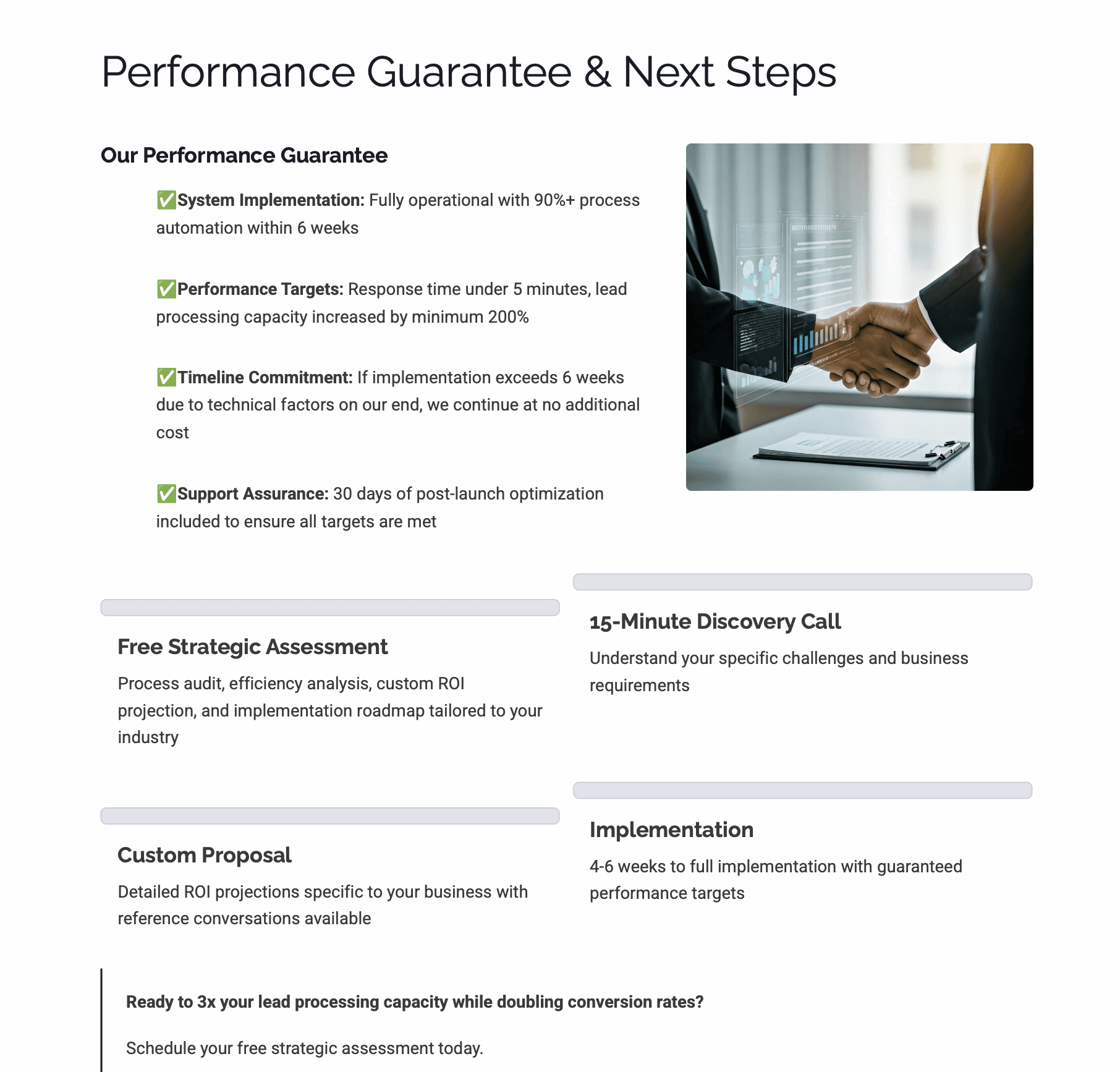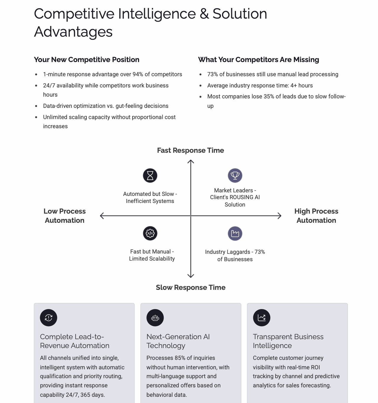 automation. Facing operational chaos with 100+ daily leads across multiple channels and response delays of 6-24 hours, the client achieved remarkable results in just six weeks: 340% ROI within six weeks, 90% automation of lead processing, saving $150k+ annually, 45% revenue increase through doubled conversion rates, and response times reduced from hours to minutes. The implementation required minimal disruption and zero internal IT resources, creating a sustainable competitive advantage.