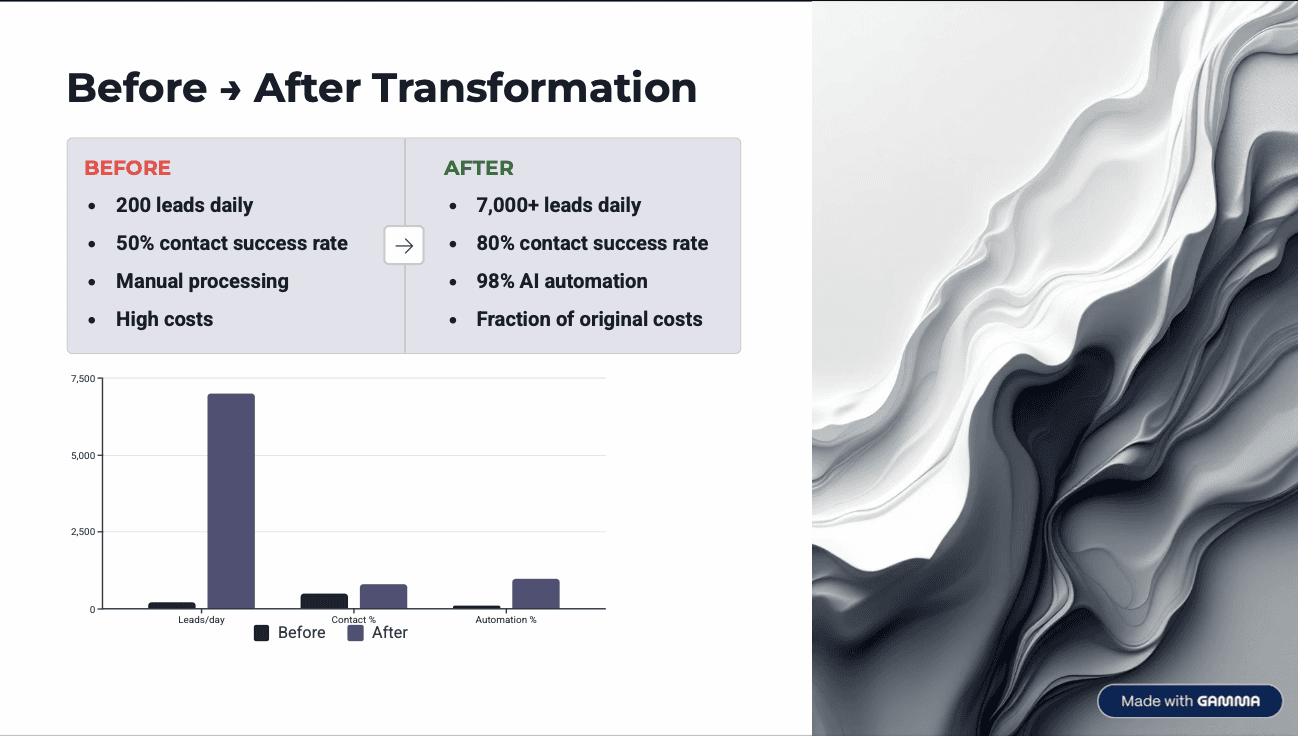 The Business Impact: Rawast Group transformed from a capacity-constrained operation into a scalable growth engine: processing more leads in one day than they previously handled in a month, while dramatically reducing operational costs and freeing their sales team to close deals instead of chasing unqualified prospects.